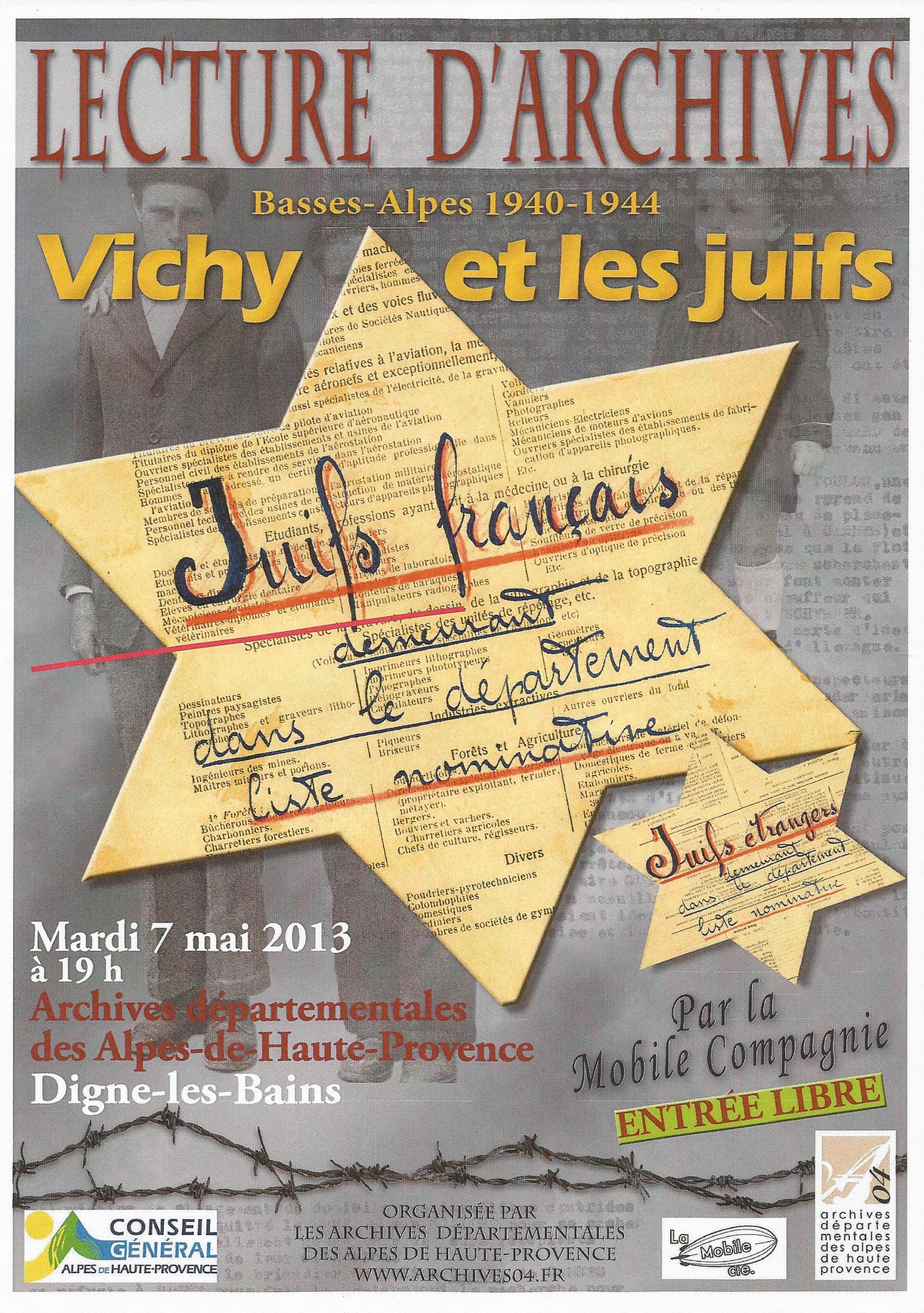 Programmation culturelle des Archives départementales 04 à l’occasion de leur exposition : Vichy et les juifs, Basses Alpes 1940-1944.
